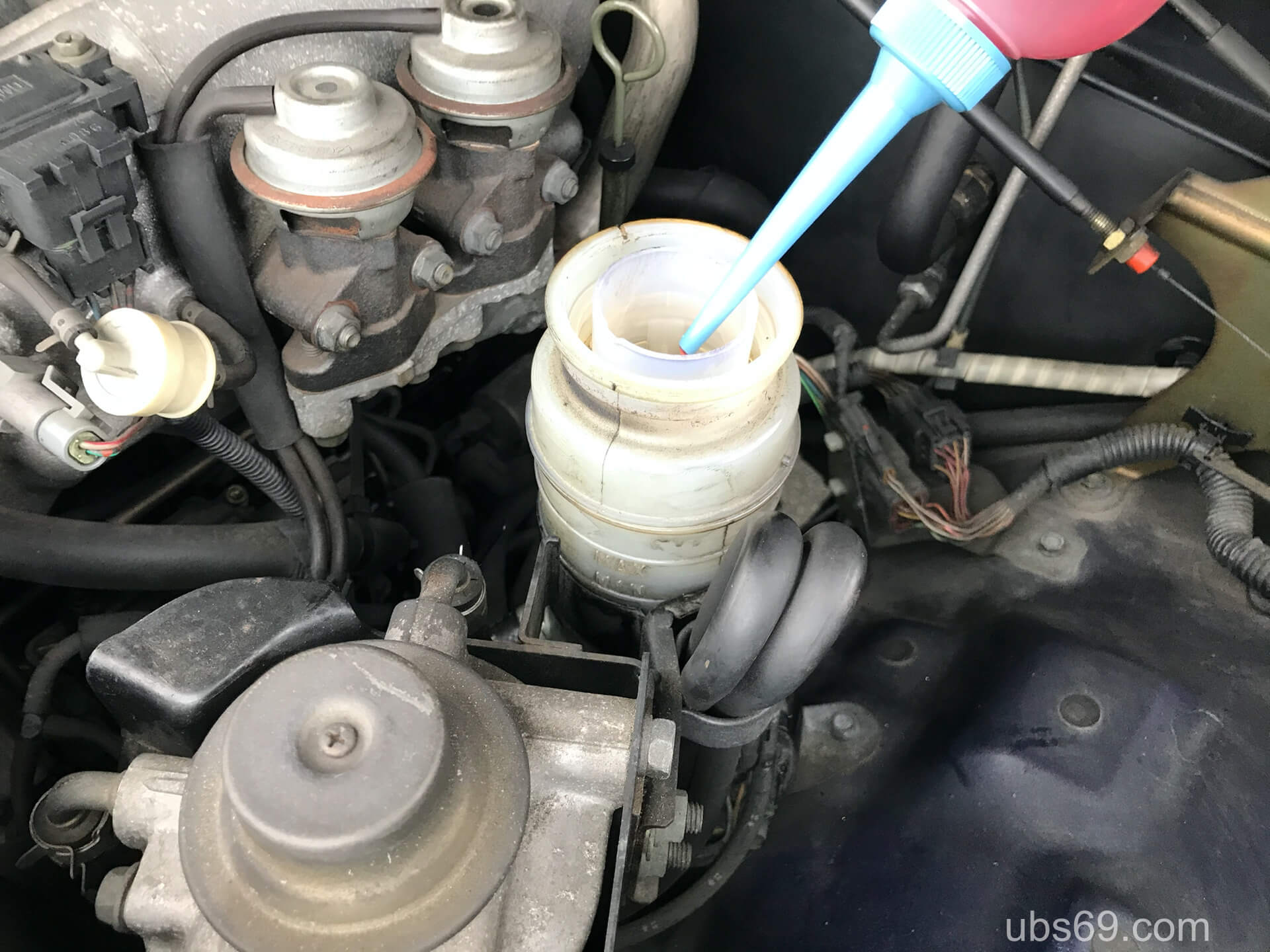 このままエンジンをかけずにハンドルを左右いっぱいに、何回か切るとエアが抜けて液面が下がります。下がったら補充 → ハンドル操作を、液面が変化しなくなるまで繰り返します。