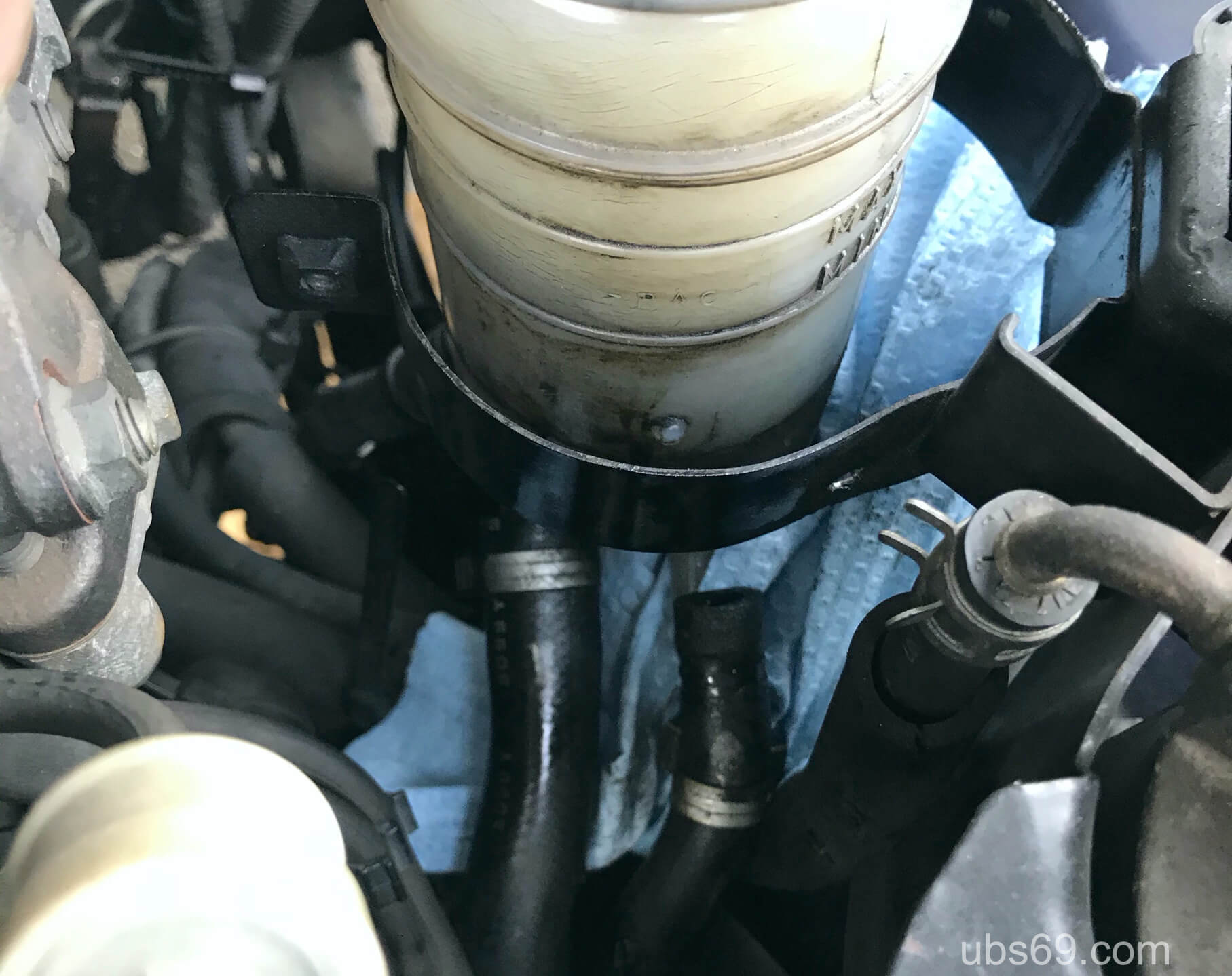リターンホースを抜くとリザーバーに入っているフルードが出てくるのであらかじめ抜いておくことでこぼす量を最小限に抑えられます。