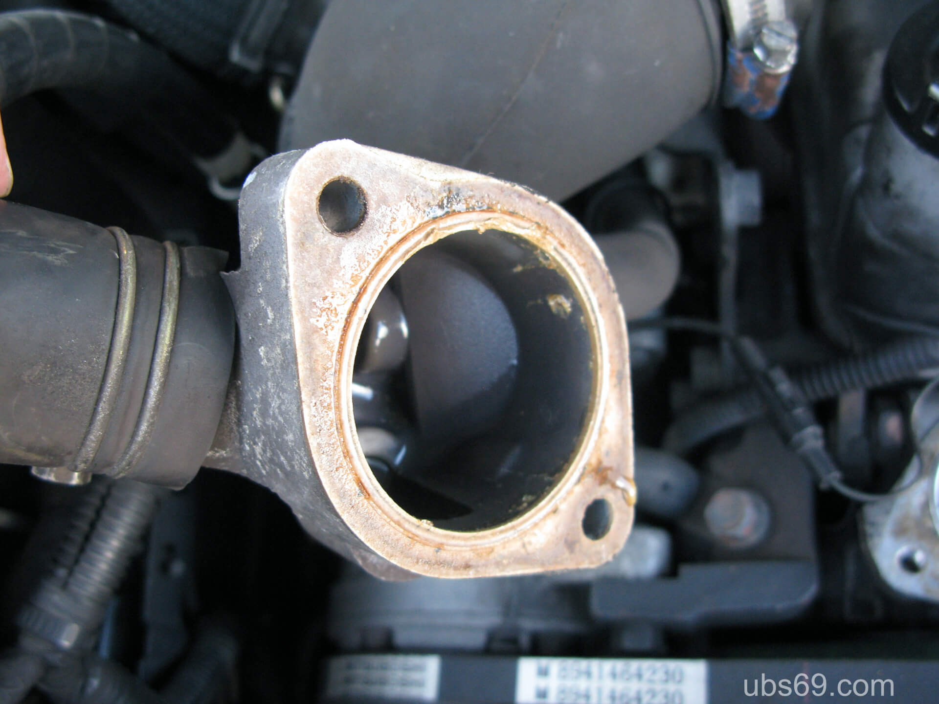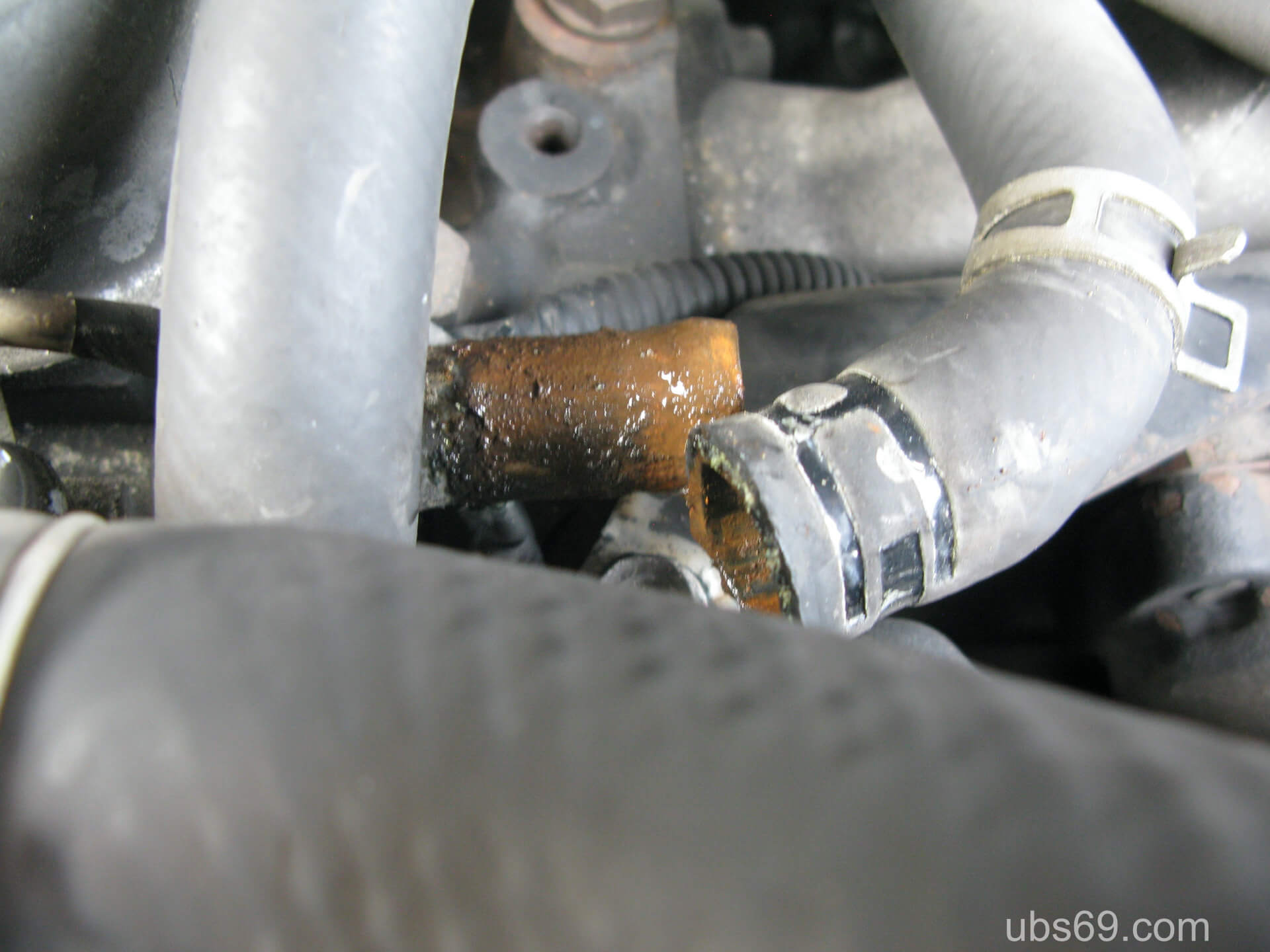 冷却水(クーラント)が通っているホースから水漏れしていました。以前から水温が上がらず、サーモスタットの交換を考えていたので、ホースとサーモスタットの交換を合わせて実施することにしました。
